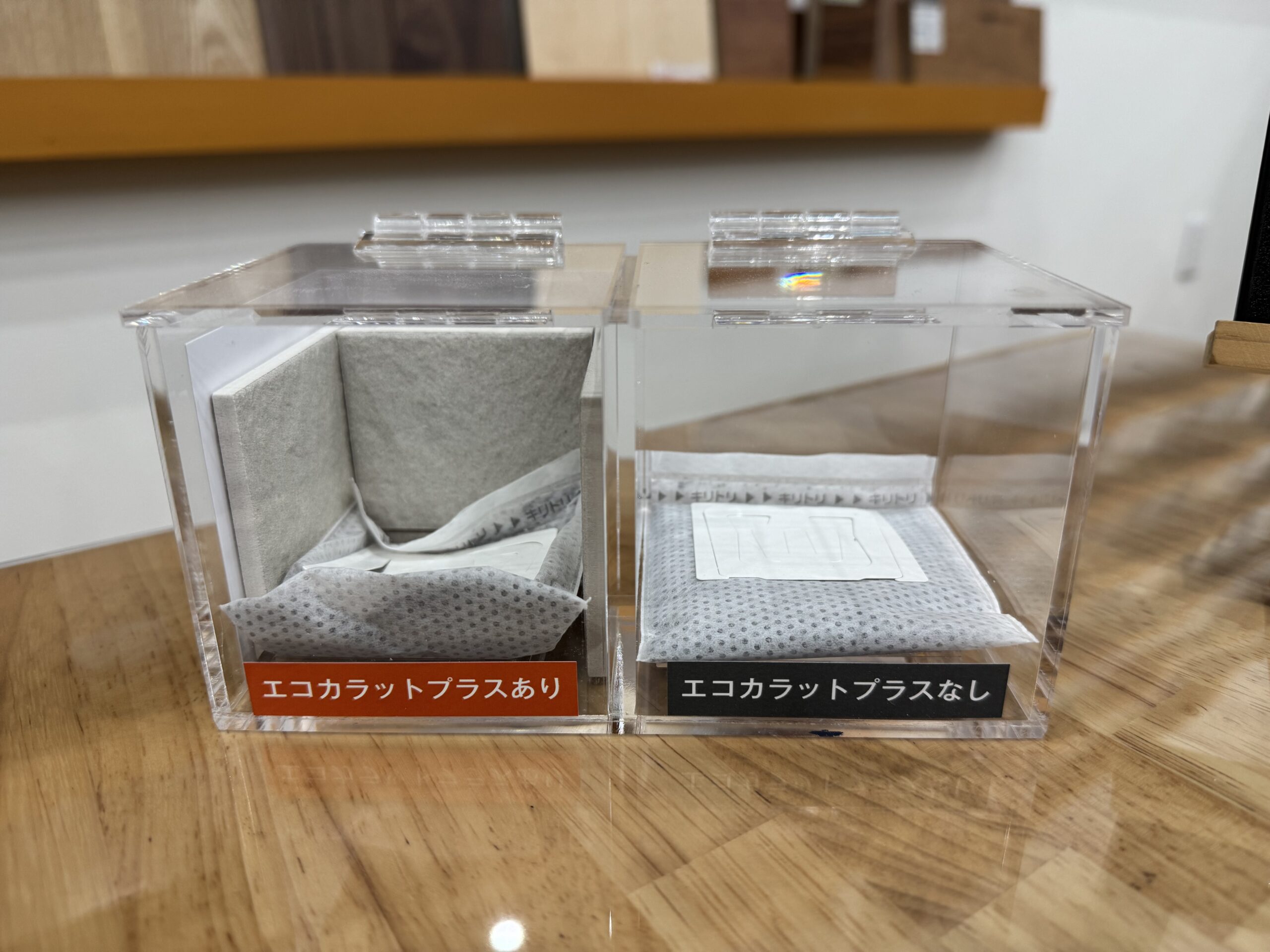 ECORAT+(エコカラットプラス)調湿デモキットを店内に設置しております。
